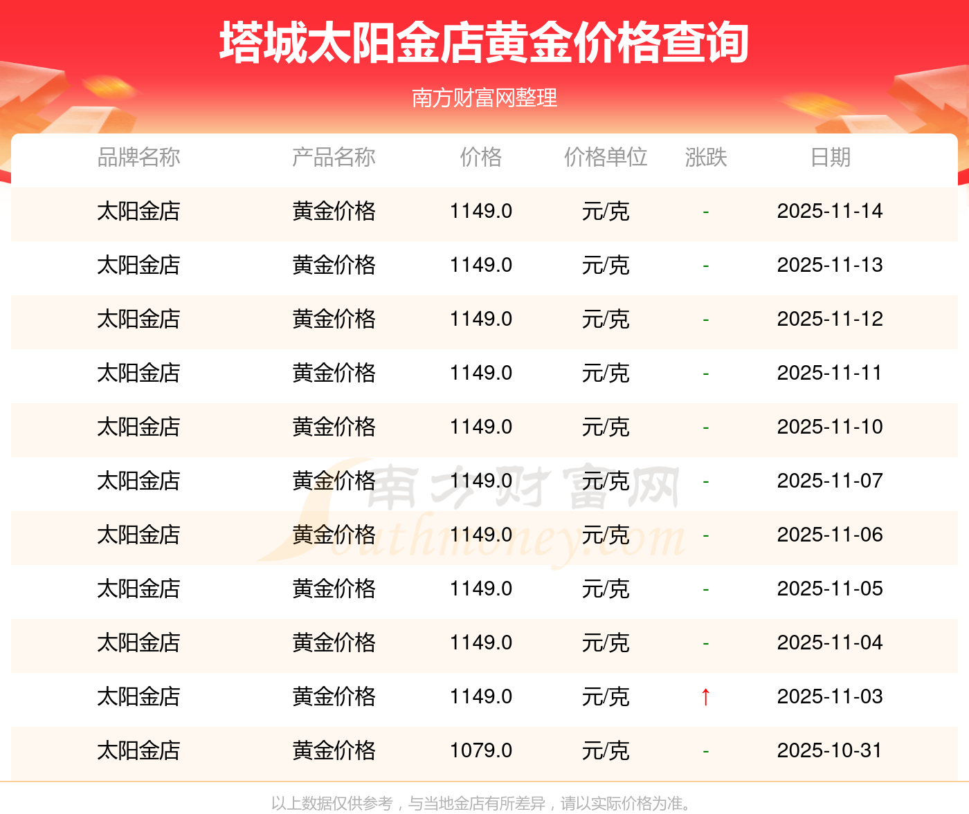 今日塔城太陽(yáng)金店黃金價(jià)格公布每克黃金在市面上的價(jià)格是怎樣的今日(2025年11月16日)塔城太陽(yáng)金店黃金價(jià)格是1149.0元/克。