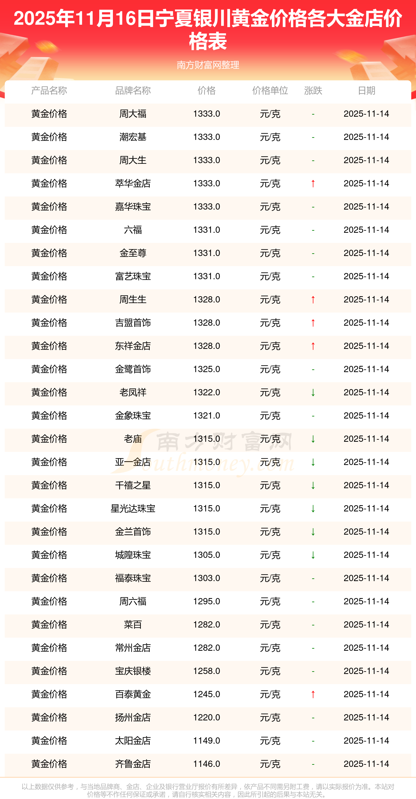 2025年11月16日寧夏銀川周大福、周大福、周大福、周大福、周大福、周大福、周大福、老鳳祥、老鳳祥、老鳳祥、周六福等各大金店品牌黃金價格最新價格行情來了,如下:周大福黃金價格1333.0元/克,周大福鉑金價格646.0元/克,周大福飾品金價(內(nèi)地)1333.0元/克,周大福黃金飾品(香港)46320.0,周大福鉑金價格(香港)18410.0,周大福金條價格(香港)41780.0,周大福金條金價(內(nèi)地)1167.0元/克,老鳳祥黃金價格1322.0元/克,老鳳祥鉑金價格600.0元/克,老鳳祥足金價格1322.0元/克,周六福黃金價格1295.0元/克。