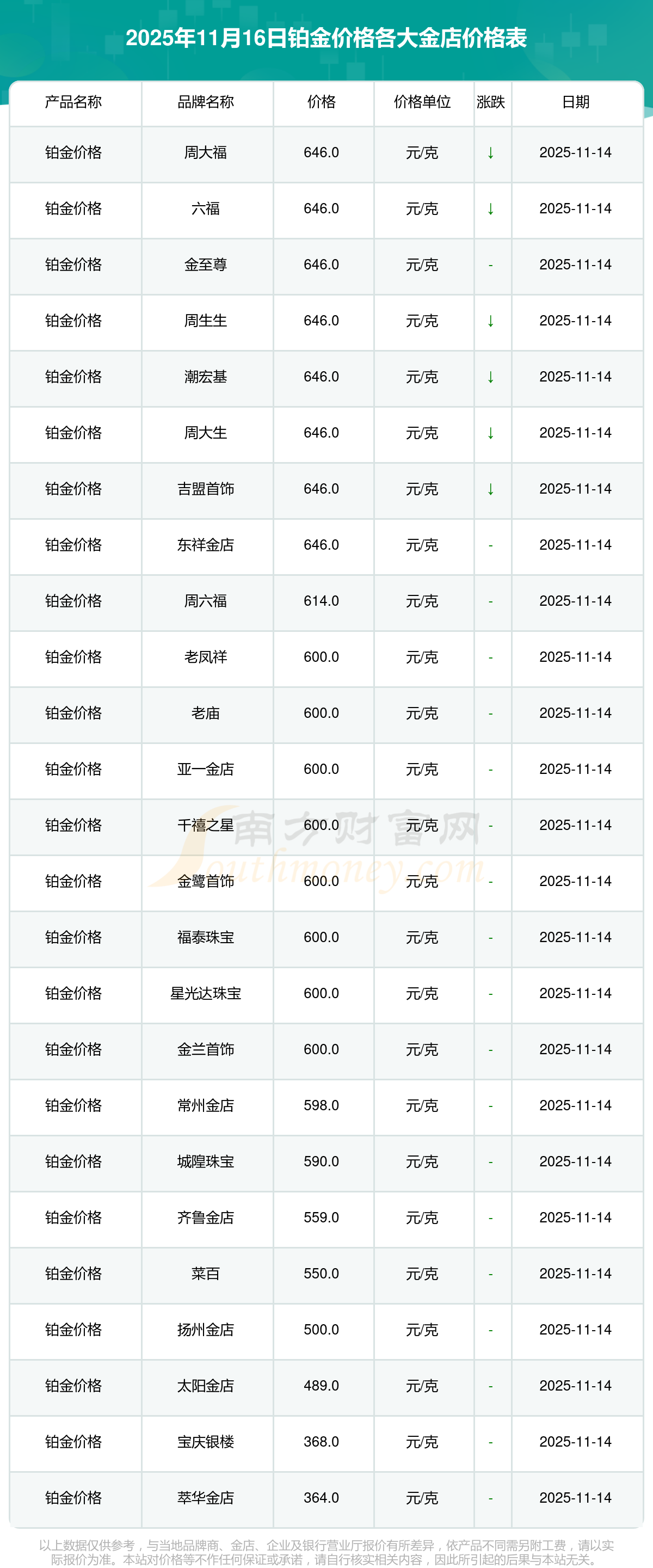 2025年11月16日周大福、周大福、周大福、周大福、周大福、周大福、周大福、老鳳祥、老鳳祥、老鳳祥、周六福等各大金店品牌鉑金價格最新價格如下:周大福黃金價格1333.0元/克,周大福鉑金價格646.0元/克,周大福飾品金價(內(nèi)地)1333.0元/克,周大福黃金飾品(香港)46320.0,周大福鉑金價格(香港)18410.0,周大福金條價格(香港)41780.0,周大福金條金價(內(nèi)地)1167.0元/克,老鳳祥黃金價格1322.0元/克,老鳳祥鉑金價格600.0元/克,老鳳祥足金價格1322.0元/克,周六福黃金價格1295.0元/克。