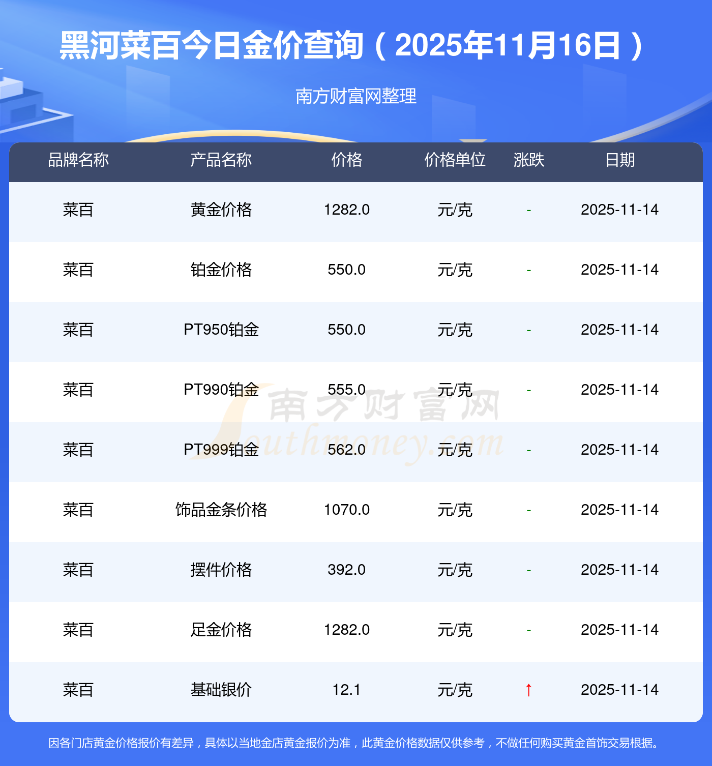 2025年11月16日黑河菜百每克黃金的市場價格是多少:黃金價格1333.0元/克,鉑金價格646.0元/克,飾品金價(內地)1333.0元/克,黃金飾品(香港)46320.0,鉑金價格(香港)18410.0,金條價格(香港)41780.0,金條金價(內地)1167.0元/克,黃金價格1322.0元/克,鉑金價格600.0元/克,足金價格1322.0元/克,黃金價格1295.0元/克。