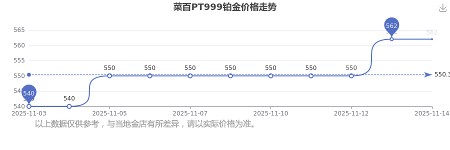 據(jù)了解,今日菜百 PT999鉑金的最新價格為562.0元/克。