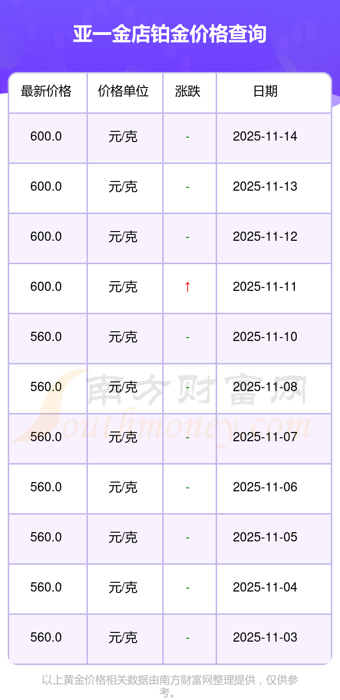 今日(2025年11月16日)亞一金店鉑金價格的價格為600.0元/克。