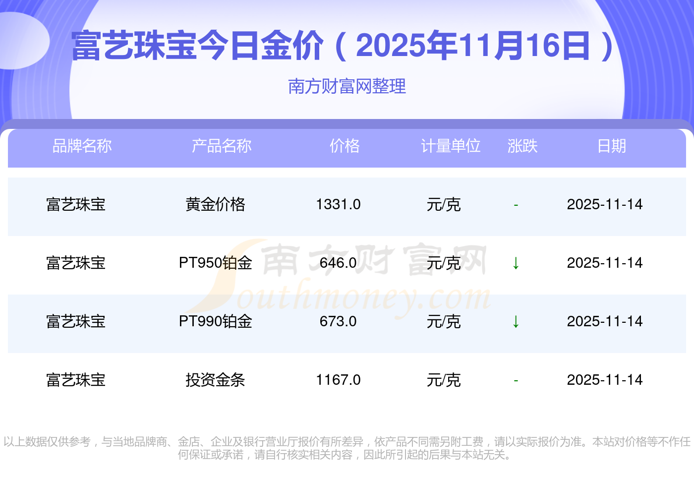 2025年11月16日富藝珠寶今日價格:黃金價格1333.0元/克,鉑金價格646.0元/克,飾品金價(內(nèi)地)1333.0元/克,黃金飾品(香港)46320.0,鉑金價格(香港)18410.0,金條價格(香港)41780.0,金條金價(內(nèi)地)1167.0元/克,黃金價格1322.0元/克,鉑金價格600.0元/克,足金價格1322.0元/克,黃金價格1295.0元/克。