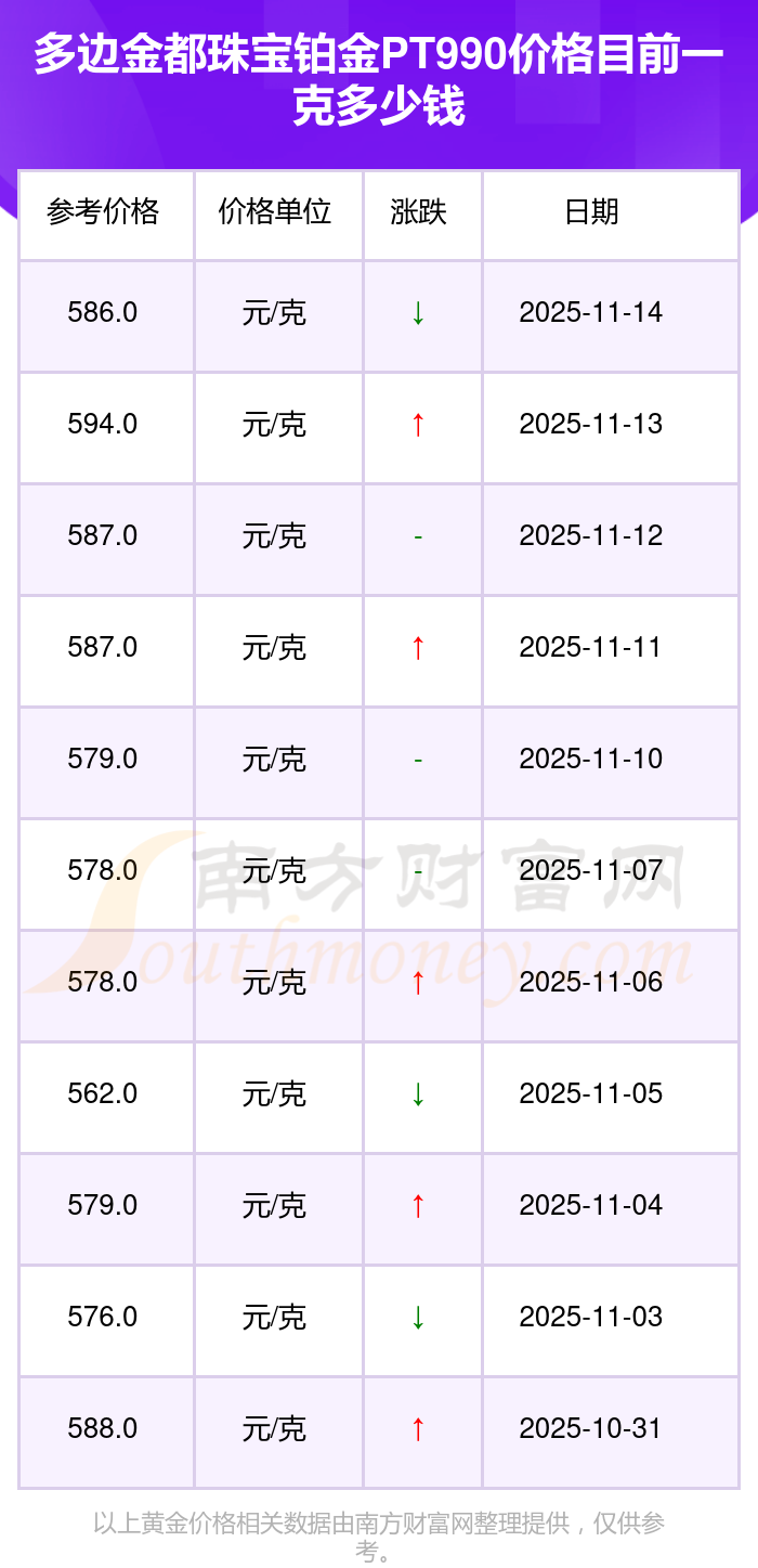 今日多邊金都珠寶鉑金PT990價(jià)格:586.0元/克。