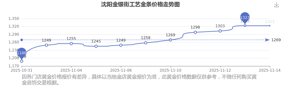 今日(2025年11月16日)沈陽金銀街工藝金條價格是1323.0元/克。