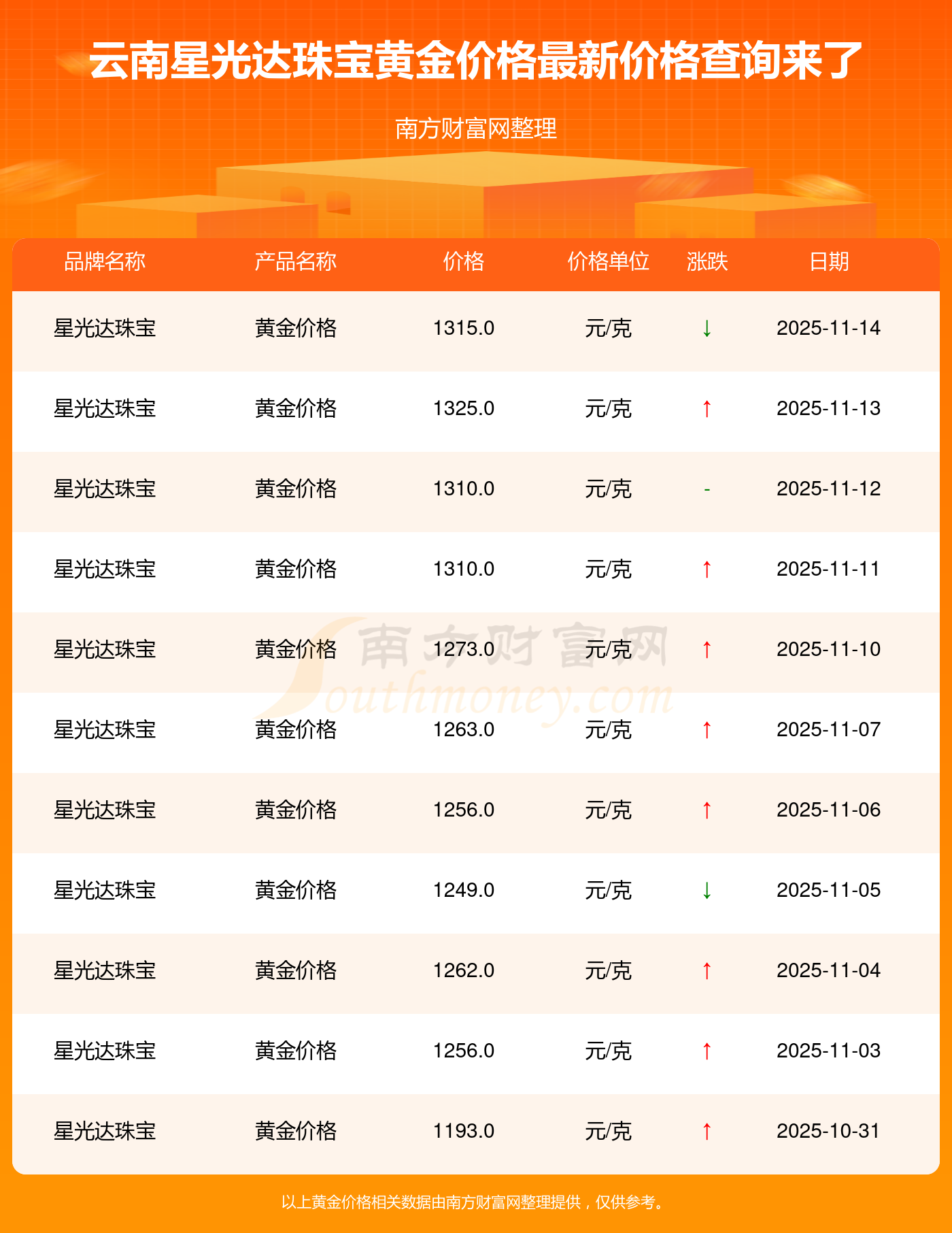 今日云南星光達(dá)珠寶黃金價(jià)格公布今日黃金每克的售賣價(jià)格為多少云南星光達(dá)珠寶黃金價(jià)格在 2025年11月16日,其市場(chǎng)價(jià)格為 1315.0元/克。