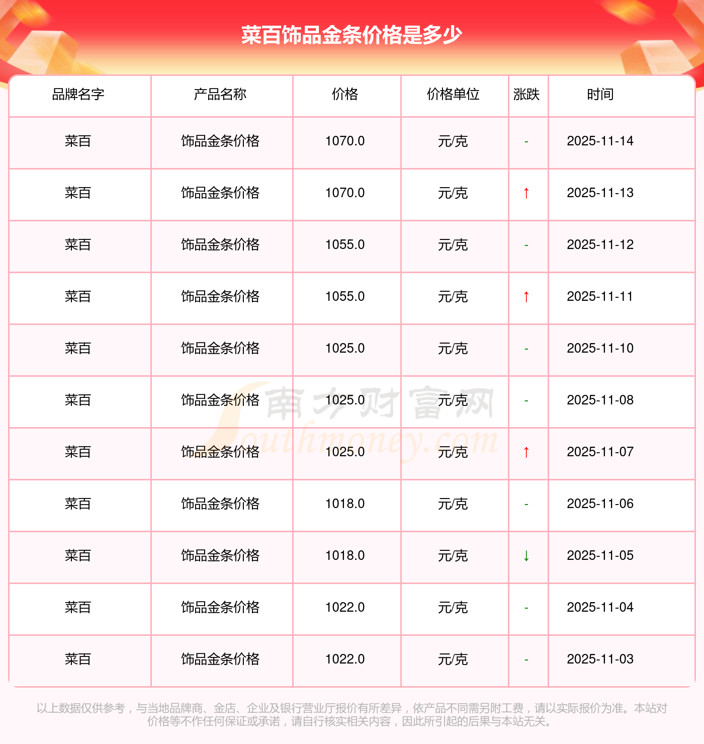 1070.0元/克的價格,是菜百今日 飾品金條價格的最新行情。