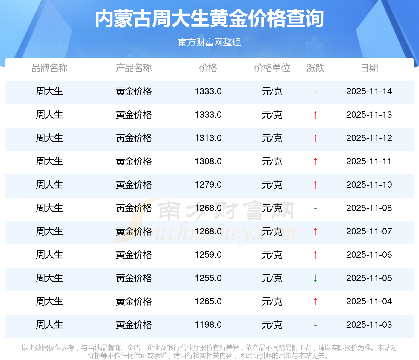 2025年11月16日,內(nèi)蒙古周大生黃金價(jià)格每克的售賣價(jià)位為1333.0元/克。