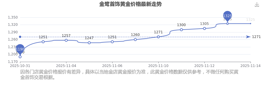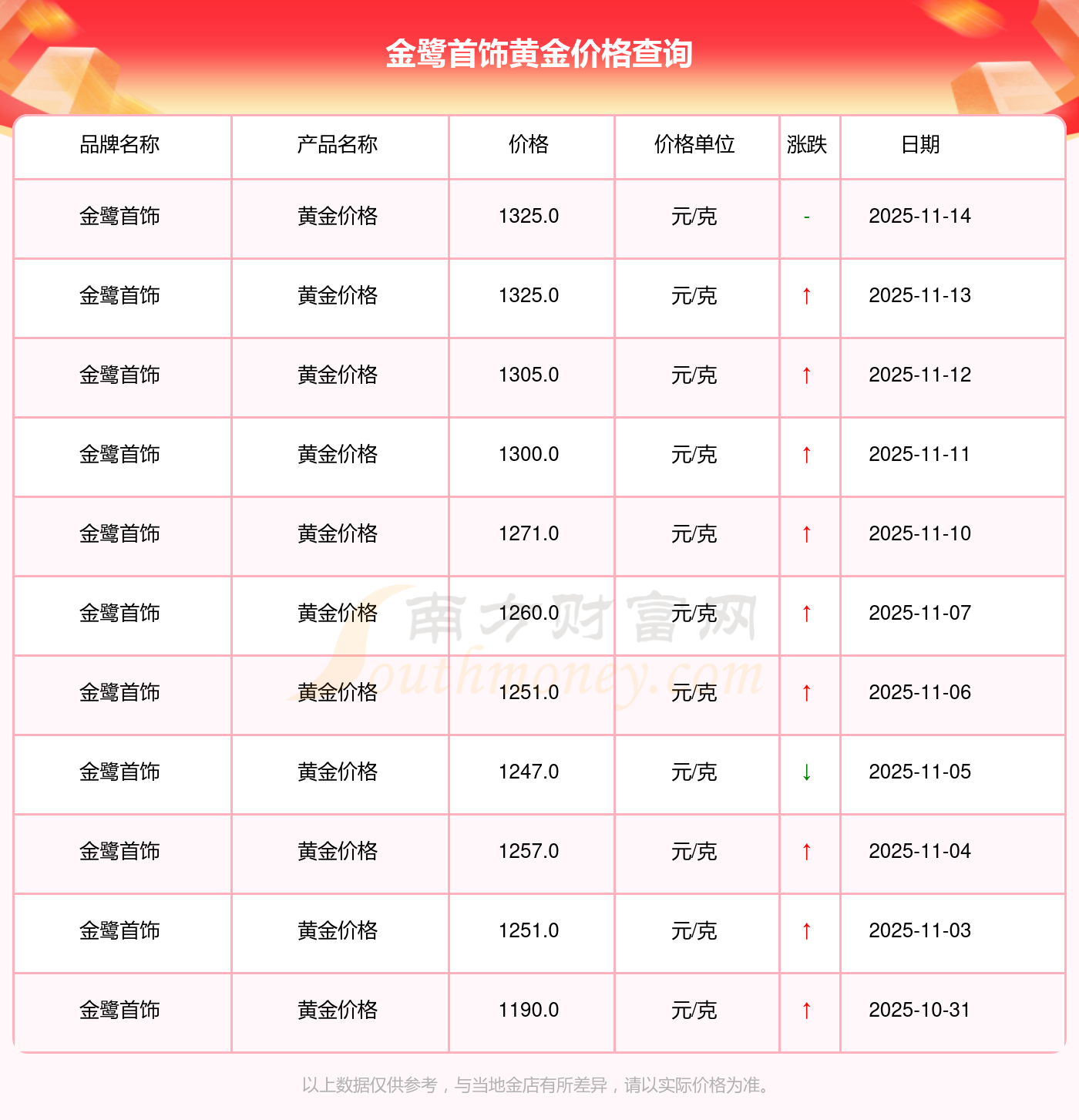 今日黃金售價(jià)是多少呢?此刻每克黃金價(jià)錢怎樣?黃金價(jià)格一般是多少錢一克?今日金鷺首飾黃金價(jià)格為1325.0元/克。