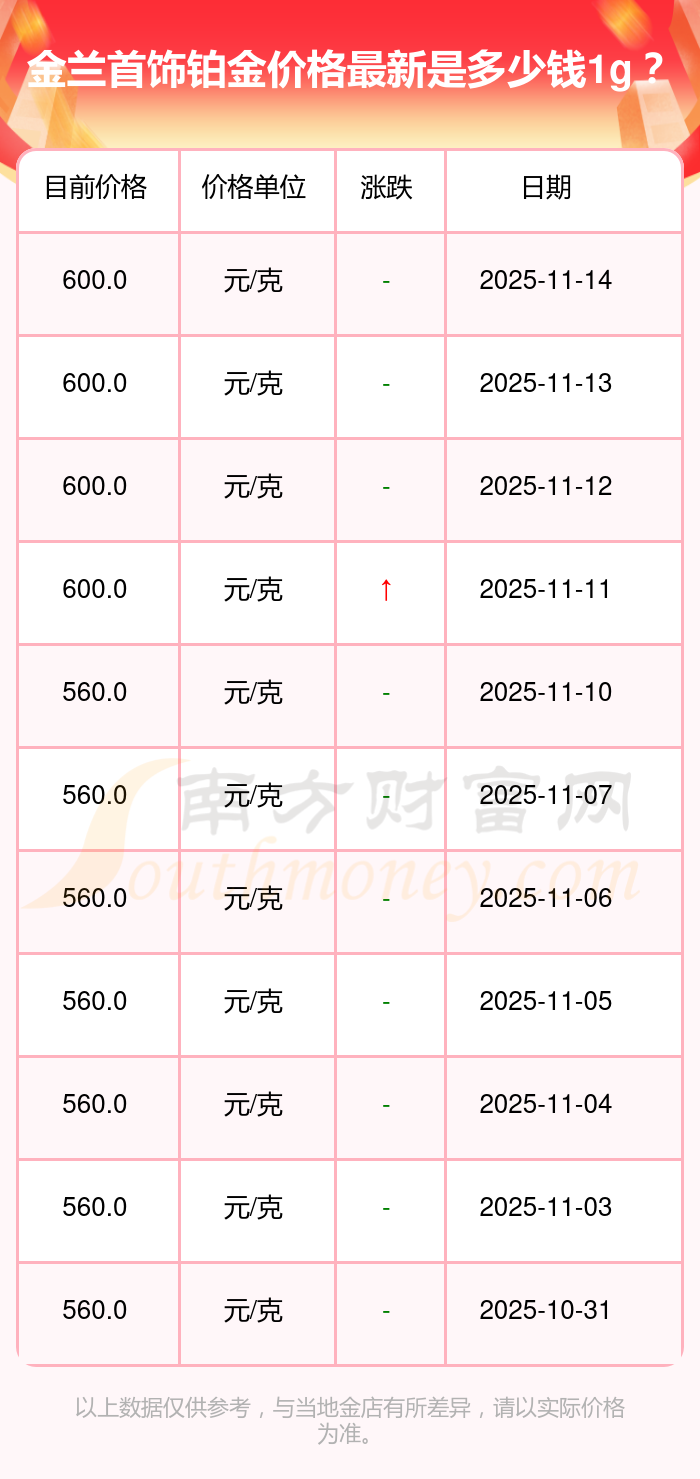 今日金蘭首飾鉑金價(jià)格最新查詢(xún):600.0元/克。