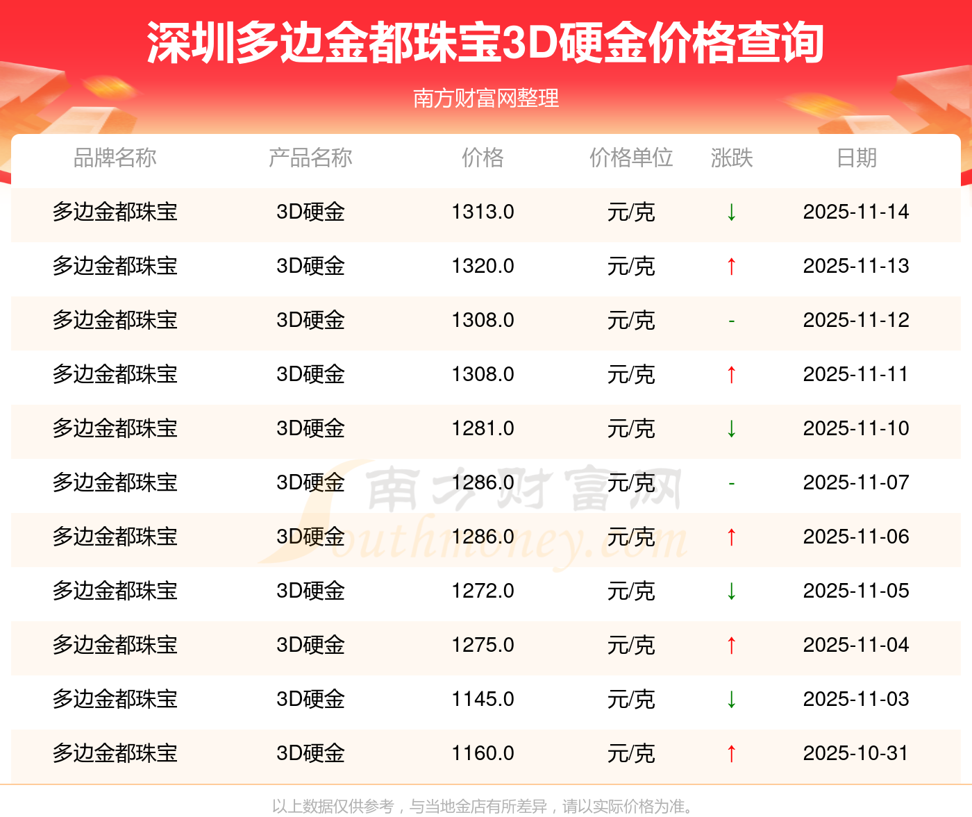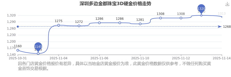2025年11月16日,深圳多邊金都珠寶所售3D硬金,其價格設(shè)定為 1313.0元/克。