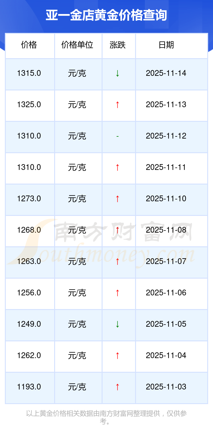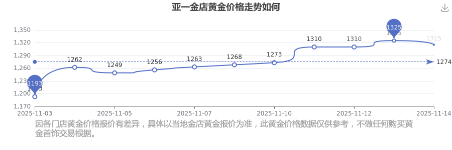 今日亞一金店 黃金價格最新的市場標(biāo)價為1315.0元/克。