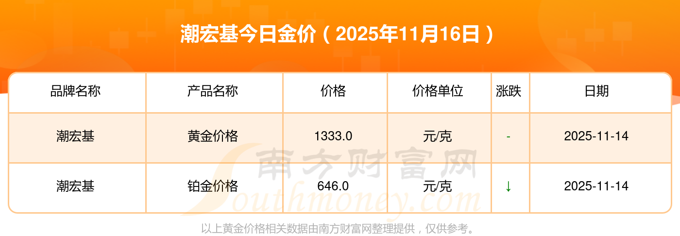 潮宏基黃金在今日的定價為多少?黃金價格1333.0元/克,鉑金價格646.0元/克,飾品金價(內地)1333.0元/克,黃金飾品(香港)46320.0,鉑金價格(香港)18410.0,金條價格(香港)41780.0,金條金價(內地)1167.0元/克,黃金價格1322.0元/克,鉑金價格600.0元/克,足金價格1322.0元/克,黃金價格1295.0元/克。