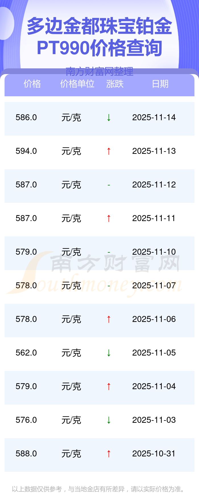 最新數(shù)據(jù)表明,多邊金都珠寶今日 鉑金PT990價格為586.0元/克。