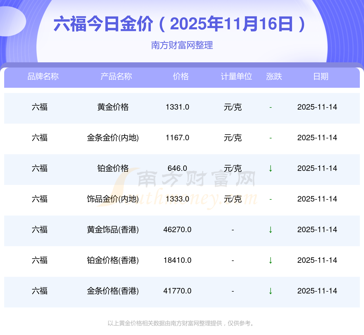 今天是2025年11月16日,周大福、周大福、周大福、周大福、周大福、周大福、周大福、老鳳祥、老鳳祥、老鳳祥、周六福等各大金店品牌黃金價(jià)格最新價(jià)格如下:周大福1333.0元/克、周大福646.0元/克、周大福1333.0元/克、周大福46320.0、周大福18410.0、周大福41780.0、周大福1167.0元/克、老鳳祥1322.0元/克、老鳳祥600.0元/克、老鳳祥1322.0元/克、周六福1295.0元/克。