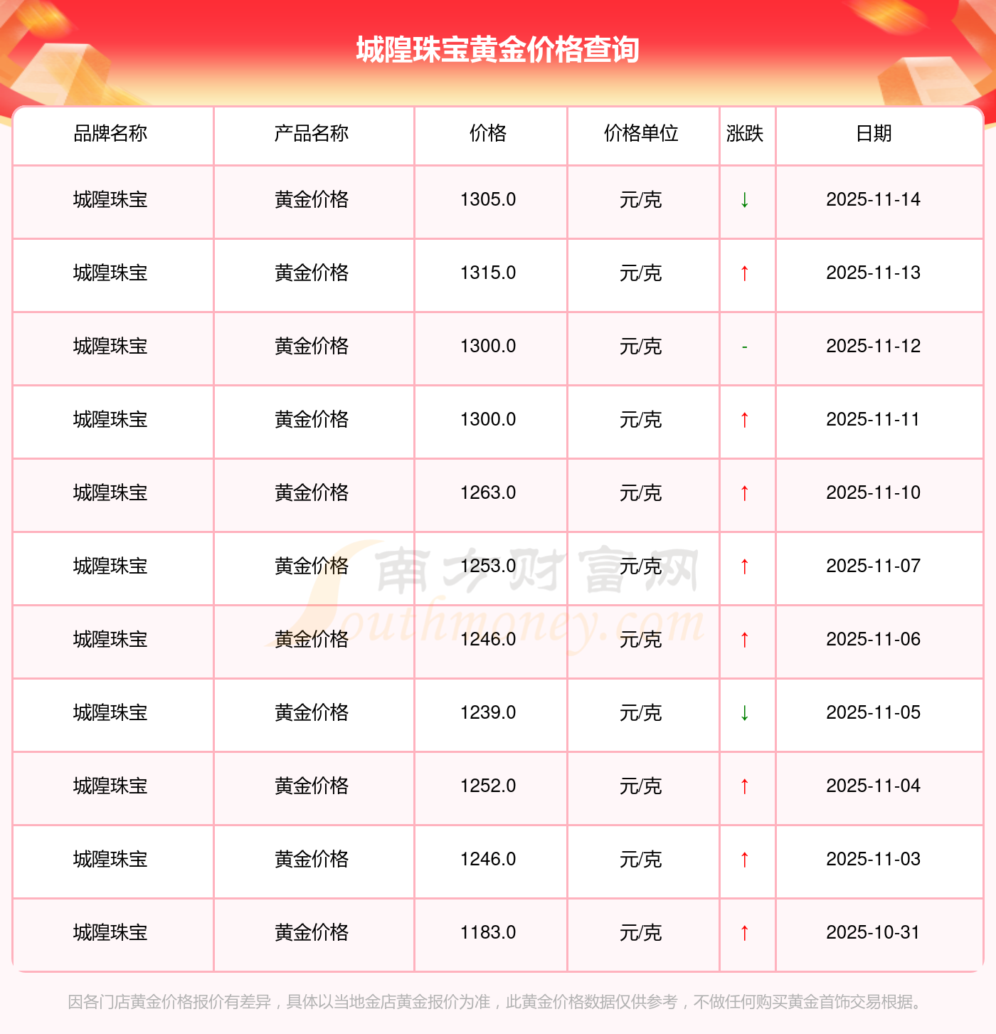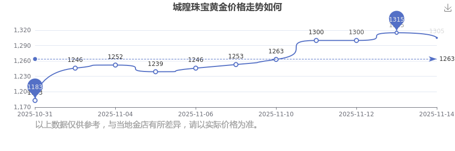城隍珠寶今日黃金價(jià)格的最新標(biāo)價(jià)為1305.0元/克。