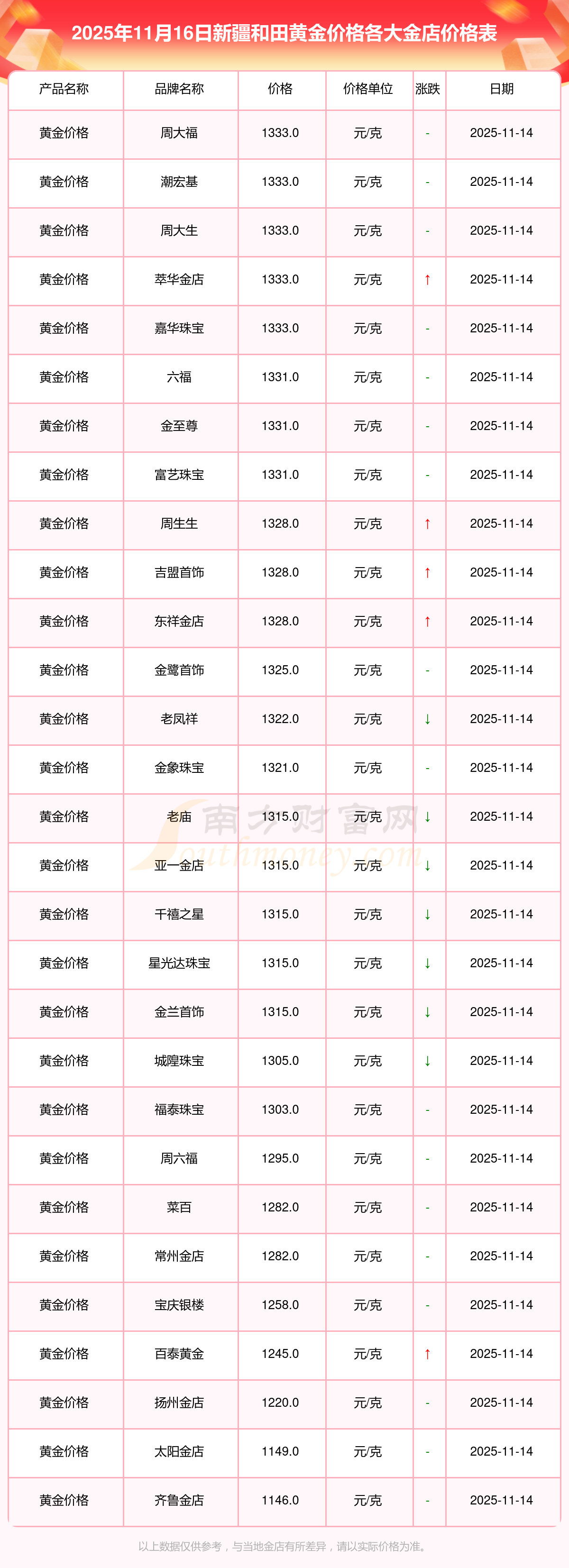 2025年11月16日新疆和田周大福、周大福、周大福、周大福、周大福、周大福、周大福、老鳳祥、老鳳祥、老鳳祥、周六福等各大金店品牌黃金價格最新價格如下:周大福黃金價格1333.0元/克,周大福鉑金價格646.0元/克,周大福飾品金價(內(nèi)地)1333.0元/克,周大福黃金飾品(香港)46320.0,周大福鉑金價格(香港)18410.0,周大福金條價格(香港)41780.0,周大福金條金價(內(nèi)地)1167.0元/克,老鳳祥黃金價格1322.0元/克,老鳳祥鉑金價格600.0元/克,老鳳祥足金價格1322.0元/克,周六福黃金價格1295.0元/克。