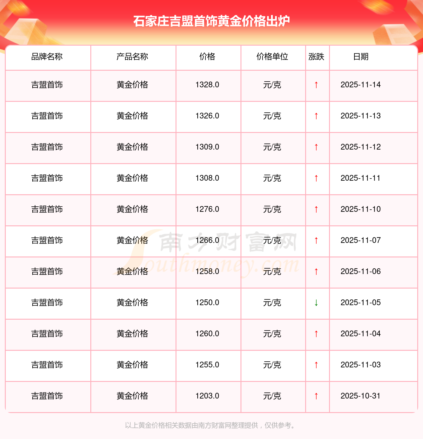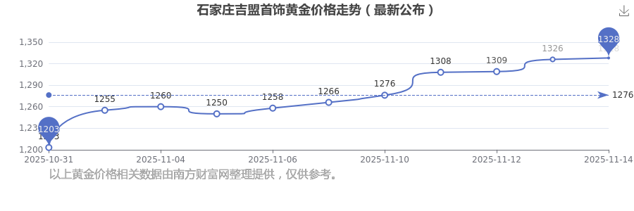 石家莊吉盟首飾黃金價(jià)格在 2025年11月16日,其市場(chǎng)價(jià)格為 1328.0元/克。