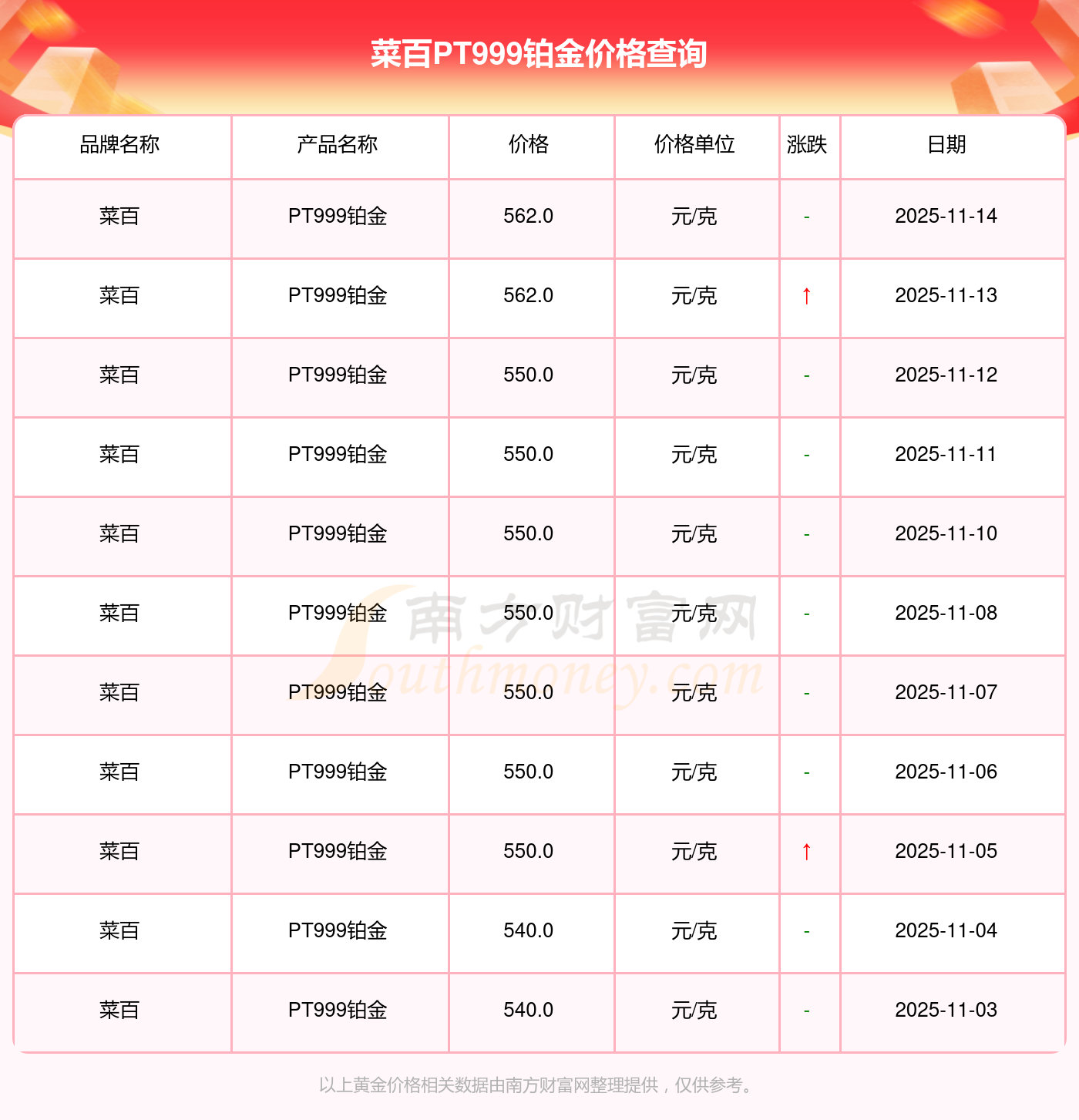 菜百 PT999鉑金今日最新的價(jià)位是562.0元/克。
