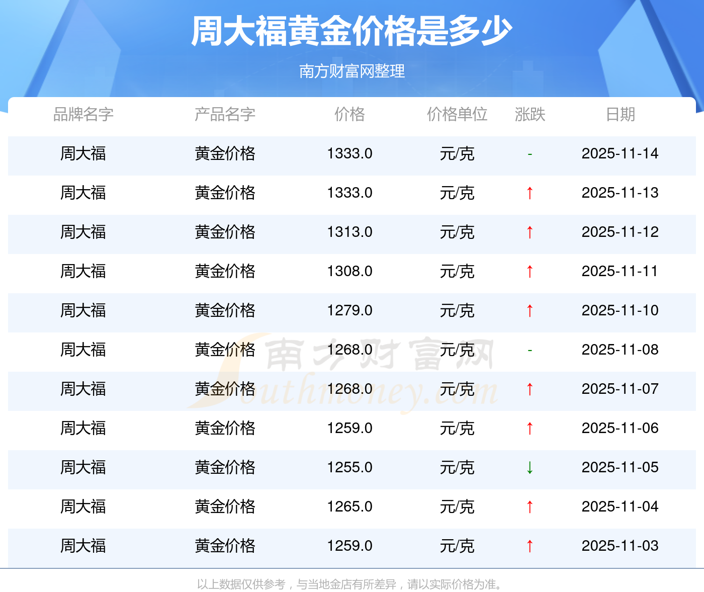 今日(2025年11月16日),周大福黃金價格最新價格是1333.0元/克。
