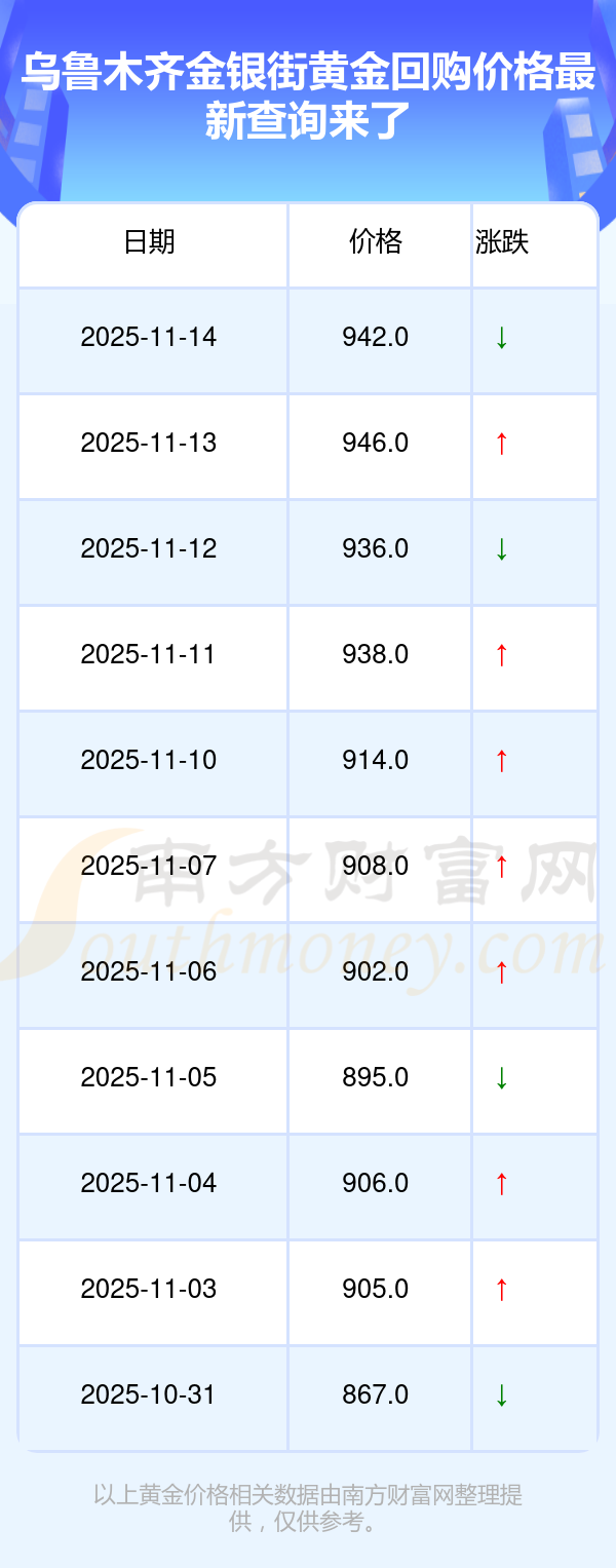 于 2025年11月16日,烏魯木齊金銀街黃金回購(gòu)的克價(jià)為942.0元/克。