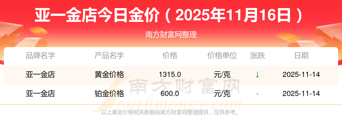 2025年11月16日周大福、周大福、周大福、周大福、周大福、周大福、周大福、老鳳祥、老鳳祥、老鳳祥、周六福等各大金店品牌黃金價(jià)格最新價(jià)格如下:周大福黃金價(jià)格1333.0元/克,周大福鉑金價(jià)格646.0元/克,周大福飾品金價(jià)(內(nèi)地)1333.0元/克,周大福黃金飾品(香港)46320.0,周大福鉑金價(jià)格(香港)18410.0,周大福金條價(jià)格(香港)41780.0,周大福金條金價(jià)(內(nèi)地)1167.0元/克,老鳳祥黃金價(jià)格1322.0元/克,老鳳祥鉑金價(jià)格600.0元/克,老鳳祥足金價(jià)格1322.0元/克,周六福黃金價(jià)格1295.0元/克。