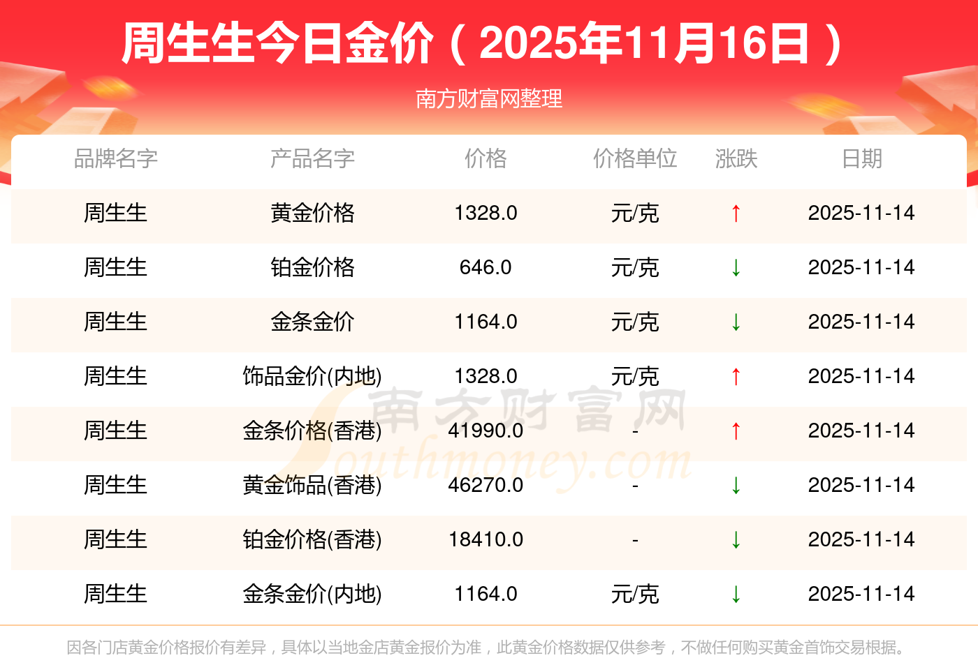現(xiàn)在周生生黃金價格是多少錢1克_2025年周生生今日金價是多少錢一克,最新周生生查詢,2025年11月16日周生生飾品金價(內(nèi)地)現(xiàn)在每克多少錢?最新周生生飾品金價(內(nèi)地)報價公布,一起來看看吧!