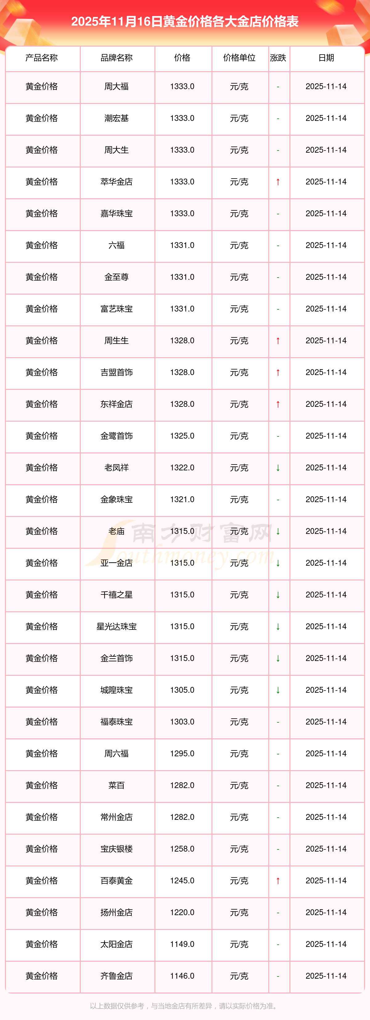 今天是2025年11月16日,周大福、周大福、周大福、周大福、周大福、周大福、周大福、老鳳祥、老鳳祥、老鳳祥、周六福等各大金店品牌黃金價格最新價格如下:周大福1333.0元/克、周大福646.0元/克、周大福1333.0元/克、周大福46320.0、周大福18410.0、周大福41780.0、周大福1167.0元/克、老鳳祥1322.0元/克、老鳳祥600.0元/克、老鳳祥1322.0元/克、周六福1295.0元/克。