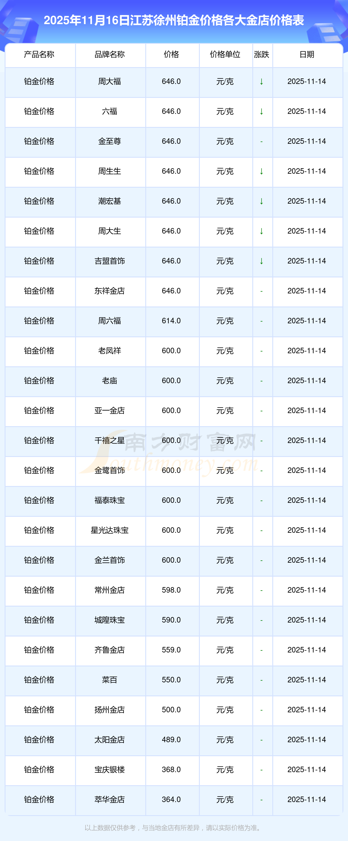 今日江蘇徐州鉑金價格最低的金店是萃華金店,報價364.0元/克,最高的是周大福,報價646.0元/克。今日鉑金價格高低差為282元/克。