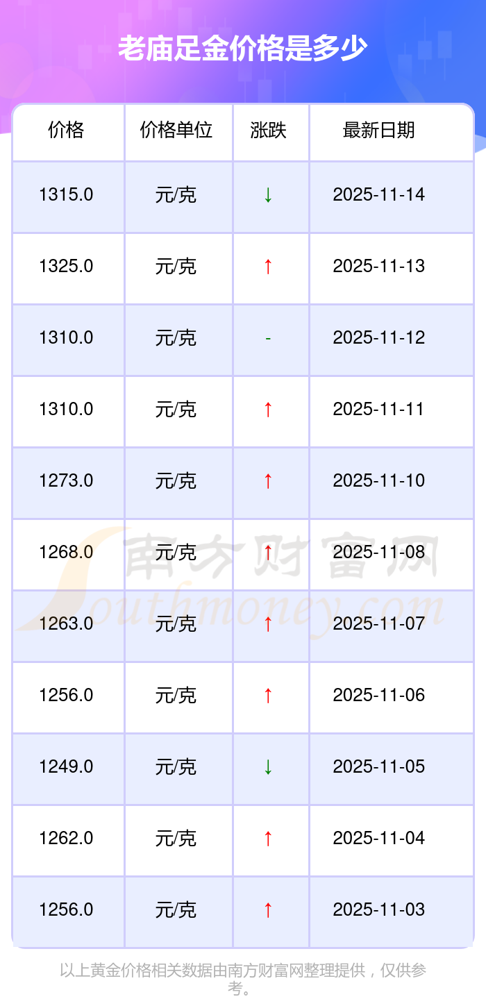 今日老廟足金價(jià)格最新價(jià)格為1315.0元/克。