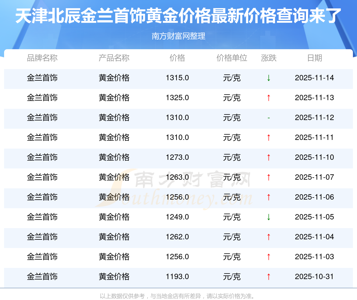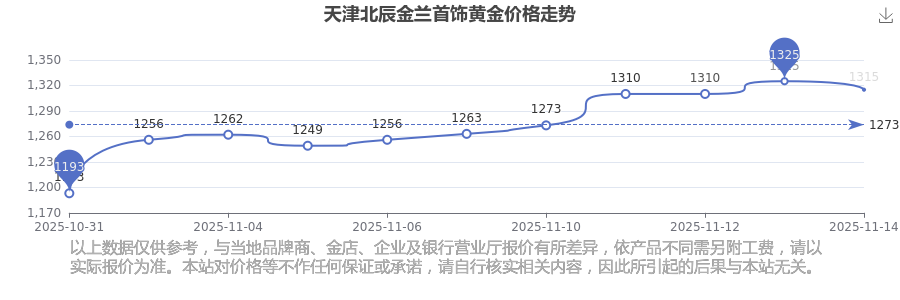 2025年11月16日天津北辰金蘭首飾黃金價格為1315.0元/克。