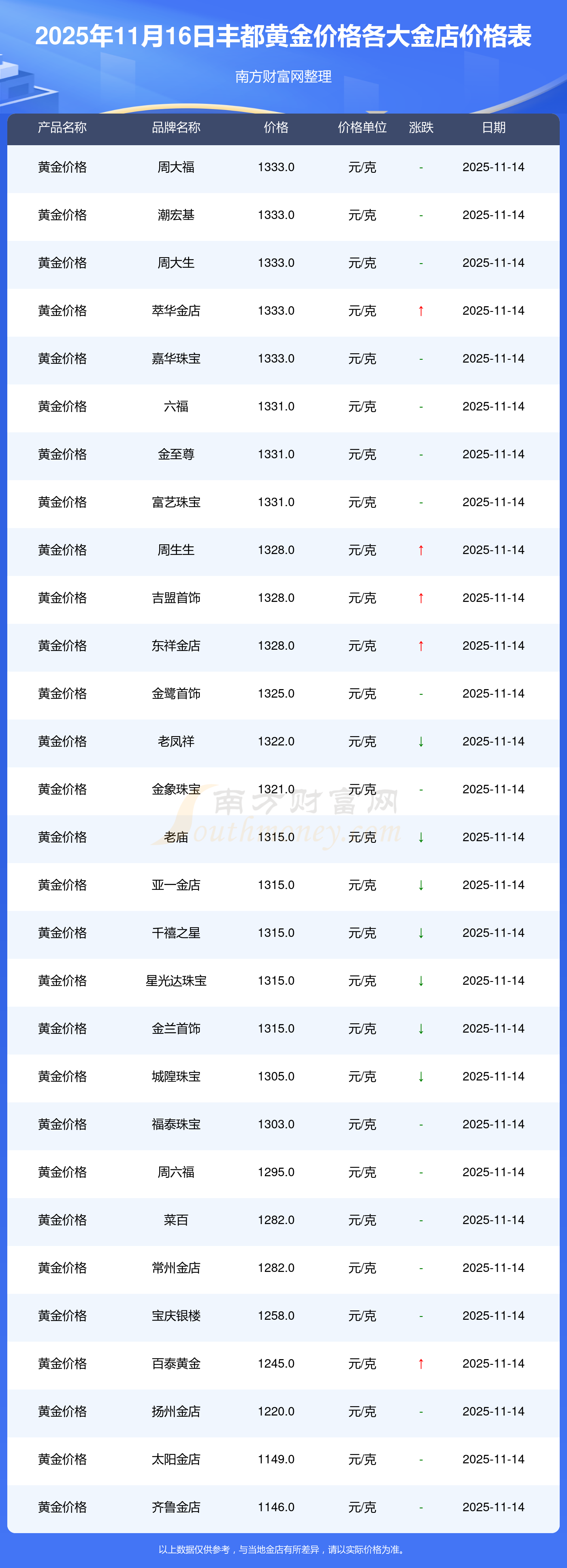一、2025年11月16日豐都周大福、周大福、周大福、周大福、周大福、周大福、周大福、老鳳祥、老鳳祥、老鳳祥、周六福等各大金店品牌黃金價格最新價格行情來了,如下:周大福黃金價格1333.0元/克,周大福鉑金價格646.0元/克,周大福飾品金價(內地)1333.0元/克,周大福黃金飾品(香港)46320.0,周大福鉑金價格(香港)18410.0,周大福金條價格(香港)41780.0,周大福金條金價(內地)1167.0元/克,老鳳祥黃金價格1322.0元/克,老鳳祥鉑金價格600.0元/克,老鳳祥足金價格1322.0元/克,周六福黃金價格1295.0元/克。