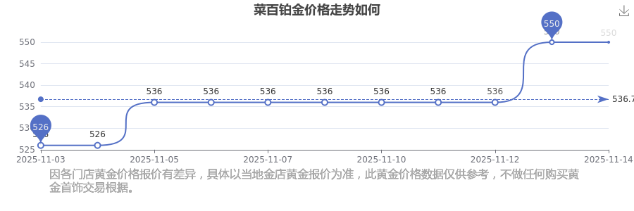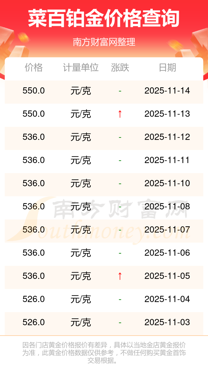 最新數(shù)據(jù)表明,菜百今日 鉑金價格為550.0元/克。