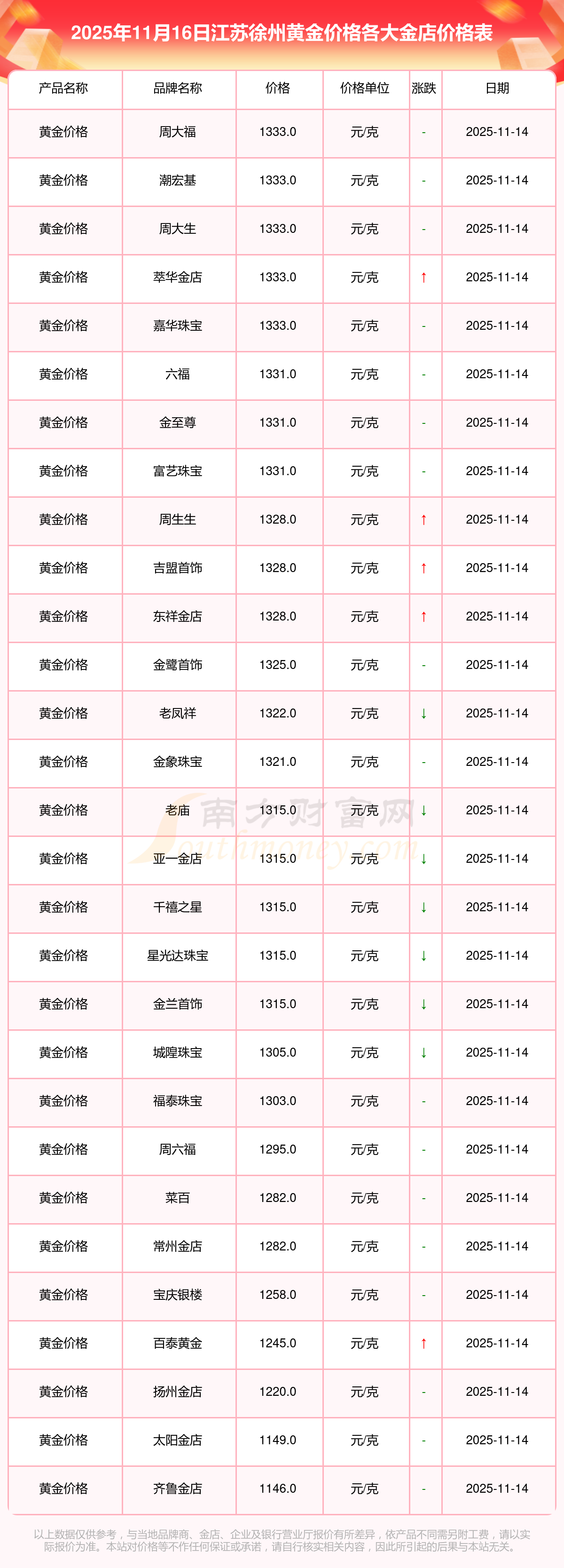 今天是2025年11月16日,江蘇徐州周大福、周大福、周大福、周大福、周大福、周大福、周大福、老鳳祥、老鳳祥、老鳳祥、周六福等各大金店品牌黃金價(jià)格最新價(jià)格行情是這樣的:周大福1333.0元/克、周大福646.0元/克、周大福1333.0元/克、周大福46320.0、周大福18410.0、周大福41780.0、周大福1167.0元/克、老鳳祥1322.0元/克、老鳳祥600.0元/克、老鳳祥1322.0元/克、周六福1295.0元/克。