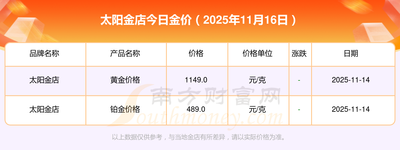 現(xiàn)在太陽金店黃金價格是多少錢1克_2025年太陽金店今日金價是多少錢一克,最新太陽金店查詢,2025年11月16日太陽金店鉑金價格現(xiàn)在每克多少錢?最新太陽金店鉑金價格報價公布,一起來看看吧!