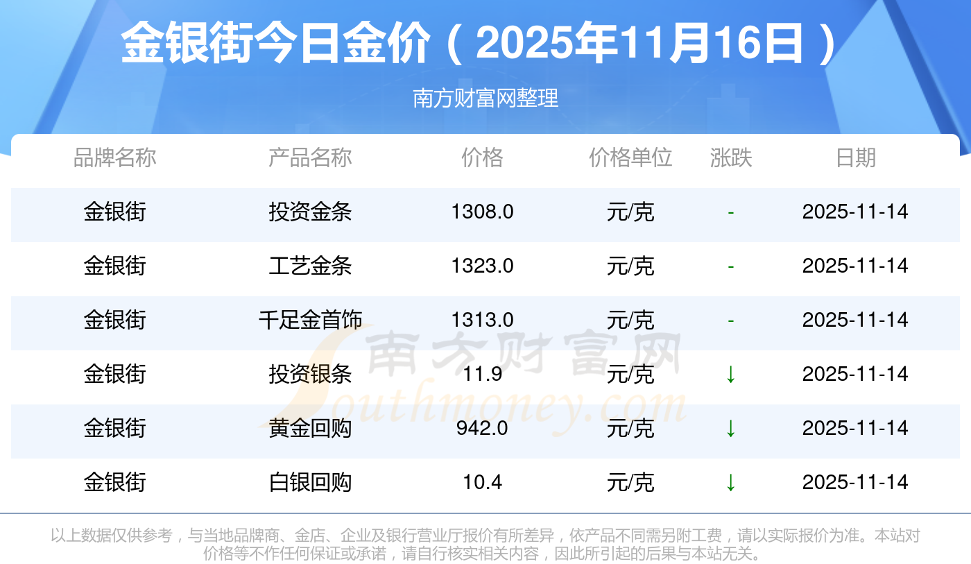 2025年11月16日金銀街最新價格:黃金價格1333.0元/克,鉑金價格646.0元/克,飾品金價(內(nèi)地)1333.0元/克,黃金飾品(香港)46320.0,鉑金價格(香港)18410.0,金條價格(香港)41780.0,金條金價(內(nèi)地)1167.0元/克,黃金價格1322.0元/克,鉑金價格600.0元/克,足金價格1322.0元/克,黃金價格1295.0元/克。
