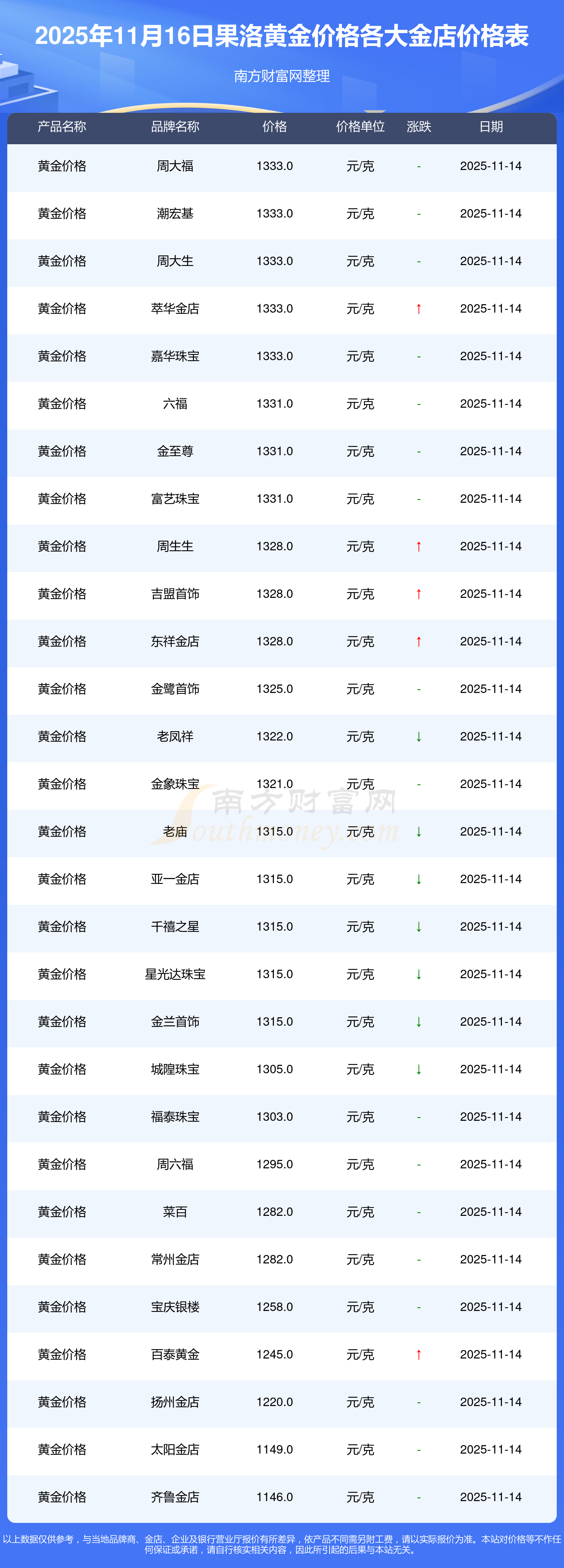 今天是2025年11月16日,果洛周大福、周大福、周大福、周大福、周大福、周大福、周大福、老鳳祥、老鳳祥、老鳳祥、周六福等各大金店品牌黃金價格最新價格行情是這樣的:周大福1333.0元/克、周大福646.0元/克、周大福1333.0元/克、周大福46320.0、周大福18410.0、周大福41780.0、周大福1167.0元/克、老鳳祥1322.0元/克、老鳳祥600.0元/克、老鳳祥1322.0元/克、周六福1295.0元/克。