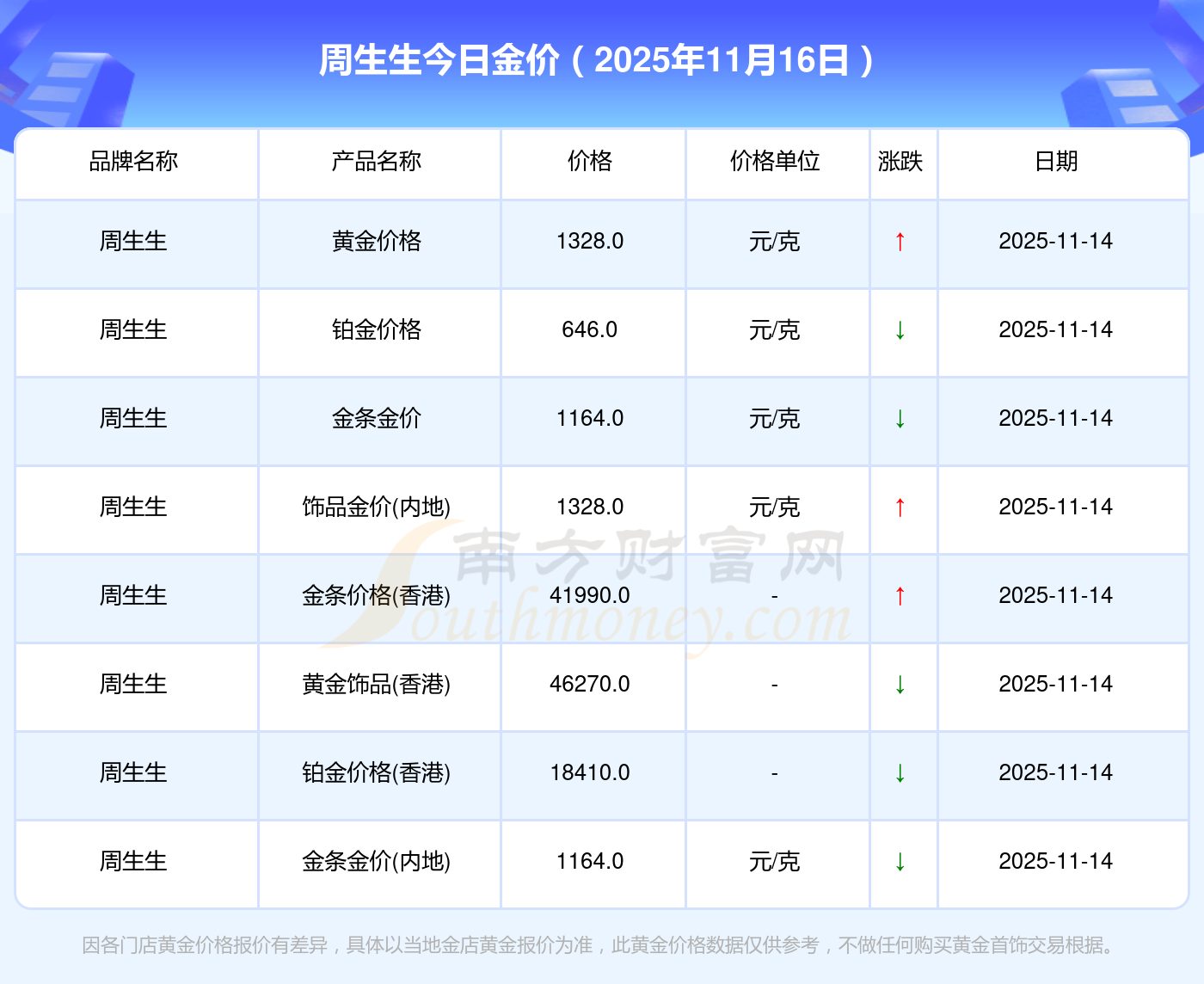 2025年11月16日周生生今日價格:黃金價格1333.0元/克,鉑金價格646.0元/克,飾品金價(內(nèi)地)1333.0元/克,黃金飾品(香港)46320.0,鉑金價格(香港)18410.0,金條價格(香港)41780.0,金條金價(內(nèi)地)1167.0元/克,黃金價格1322.0元/克,鉑金價格600.0元/克,足金價格1322.0元/克,黃金價格1295.0元/克。