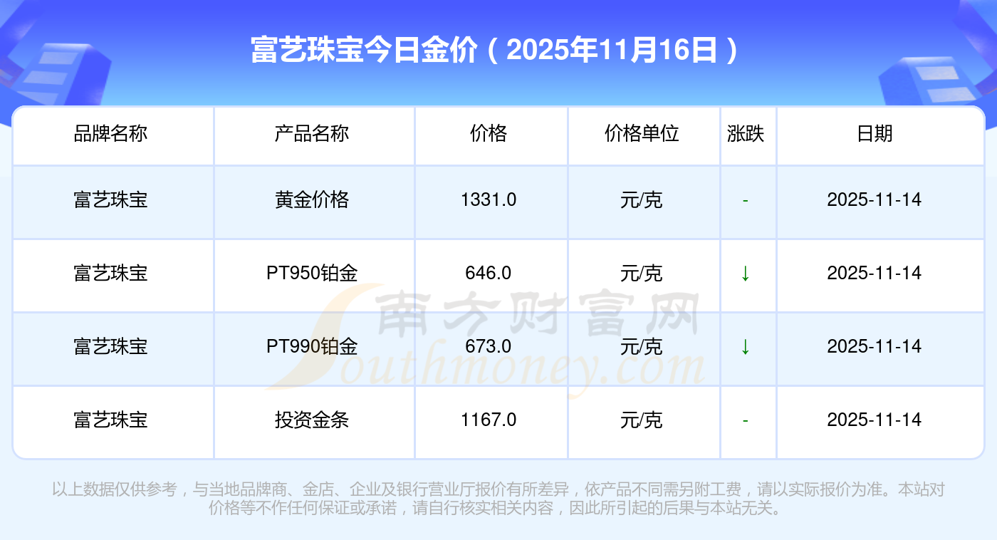 2025年11月16日富藝珠寶今日價格:黃金價格1333.0元/克,鉑金價格646.0元/克,飾品金價(內(nèi)地)1333.0元/克,黃金飾品(香港)46320.0,鉑金價格(香港)18410.0,金條價格(香港)41780.0,金條金價(內(nèi)地)1167.0元/克,黃金價格1322.0元/克,鉑金價格600.0元/克,足金價格1322.0元/克,黃金價格1295.0元/克。