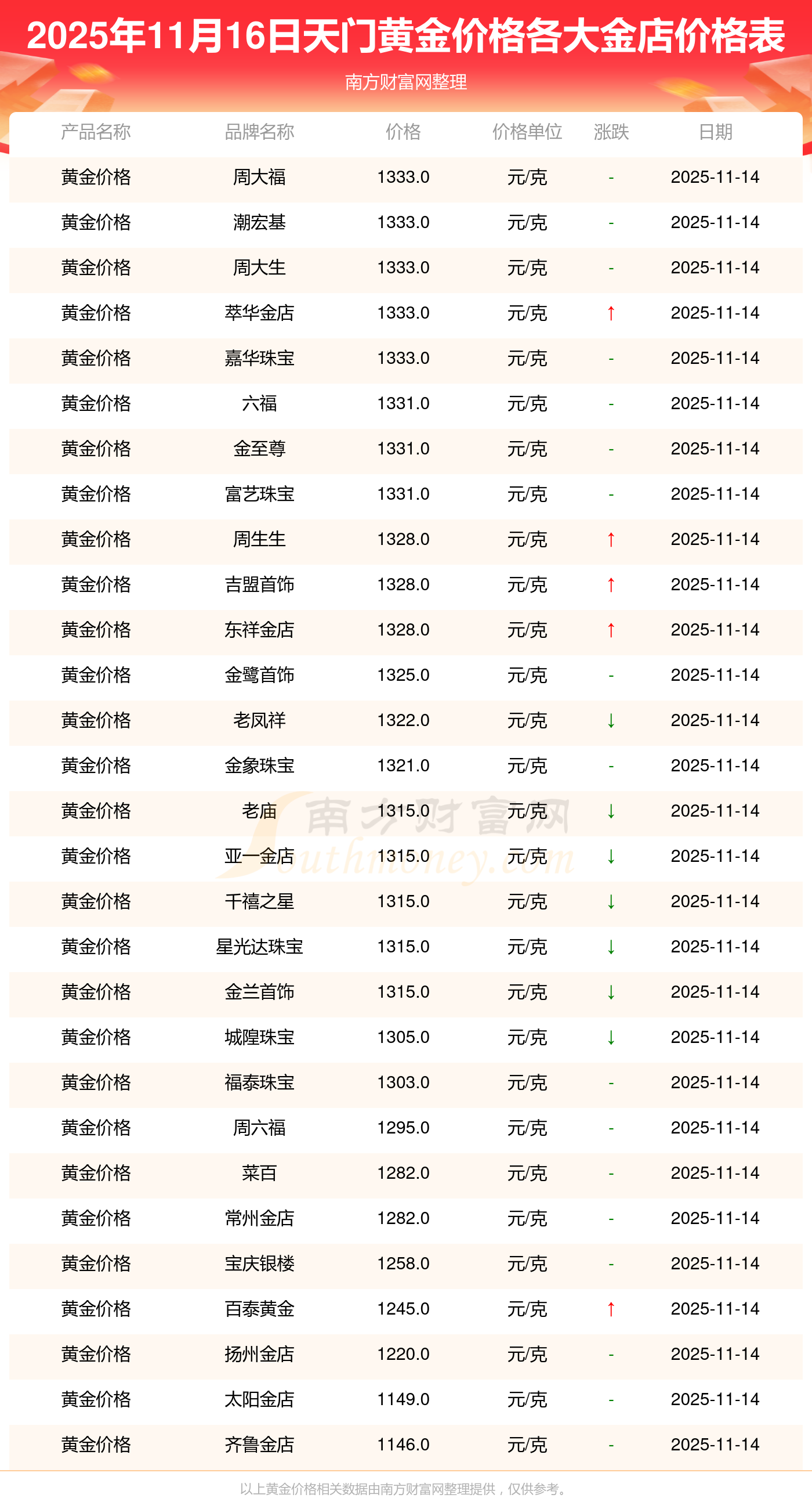 2025年11月16日,天門周大福、周大福、周大福、周大福、周大福、周大福、周大福、老鳳祥、老鳳祥、老鳳祥、周六福等各大金店品牌黃金價(jià)格今日價(jià)格如下:周大福1333.0元/克、周大福646.0元/克、周大福1333.0元/克、周大福46320.0、周大福18410.0、周大福41780.0、周大福1167.0元/克、老鳳祥1322.0元/克、老鳳祥600.0元/克、老鳳祥1322.0元/克、周六福1295.0元/克。