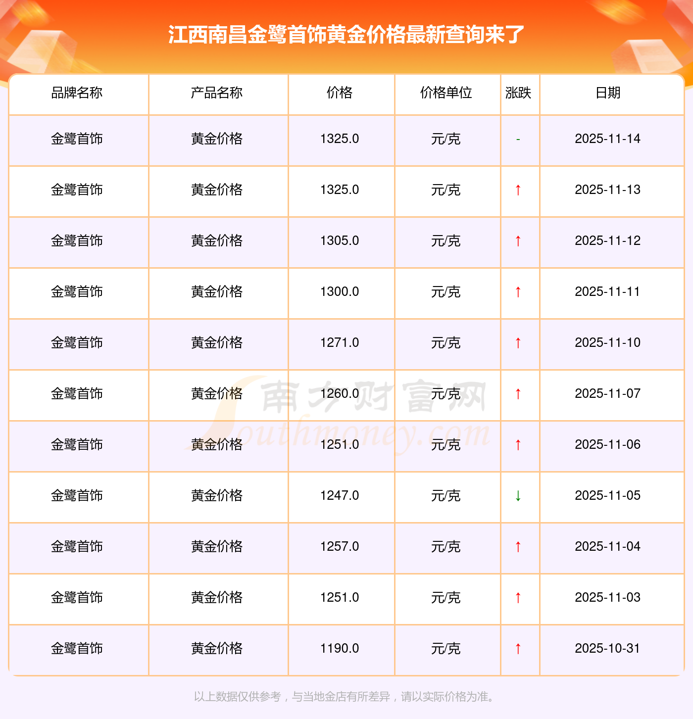 今日2025年11月16日,江西南昌金鷺首飾黃金價(jià)格為1325.0元/克。