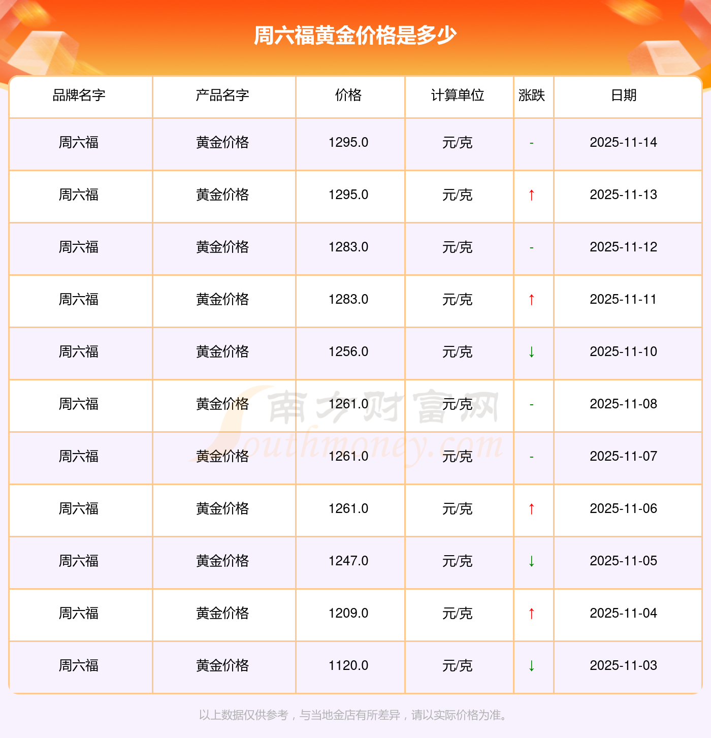 2025年11月16日周六福黃金價(jià)格最新是1295.0元/克。
