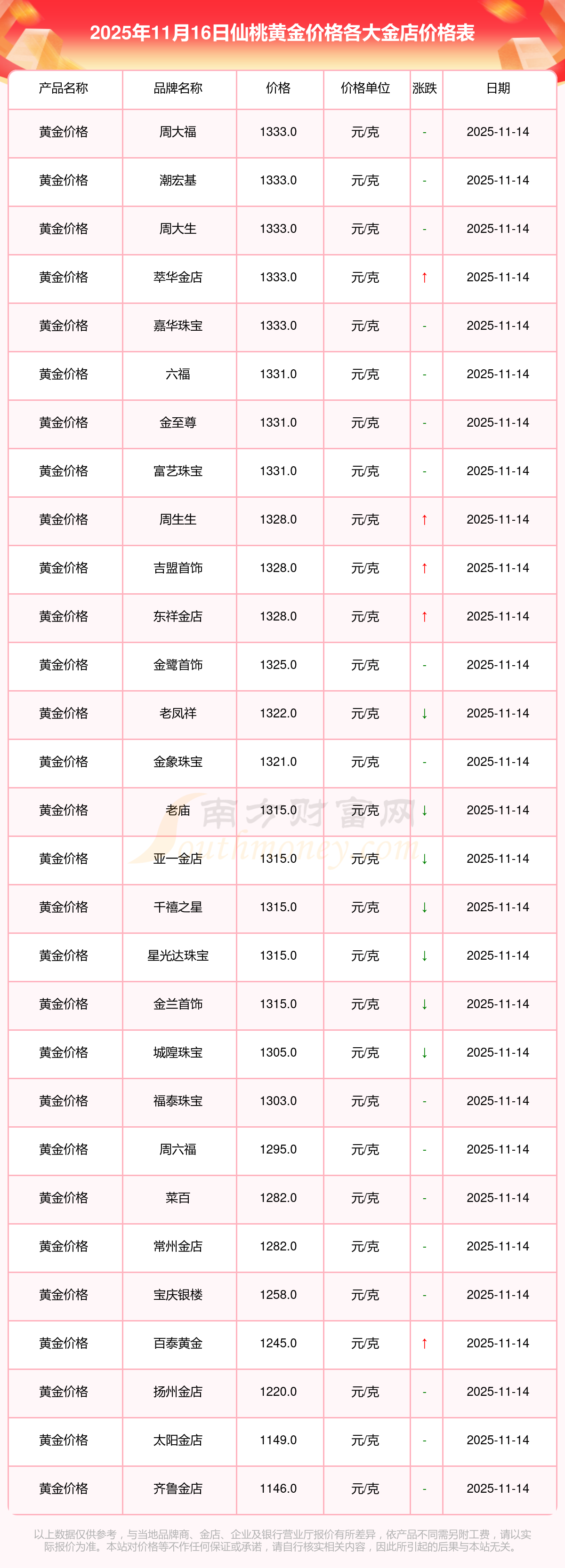 2025年11月16日仙桃各大金店黃金價(jià)格最新價(jià)格:周大福1333.0元/克,周大福646.0元/克,周大福1333.0元/克,周大福46320.0,周大福18410.0,周大福41780.0,周大福1167.0元/克,老鳳祥1322.0元/克,老鳳祥600.0元/克,老鳳祥1322.0元/克,周六福1295.0元/克。