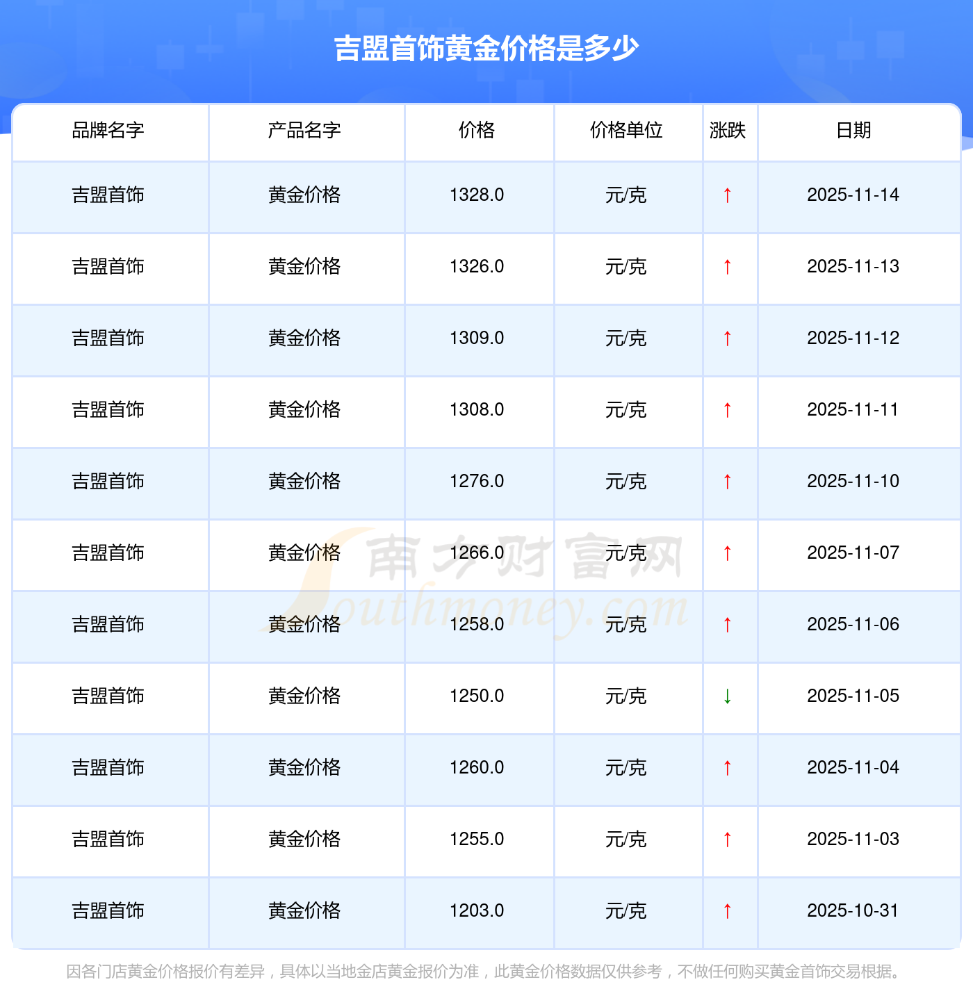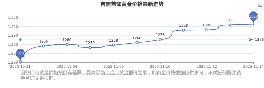 今日吉盟首飾所公布的 黃金價格最新價格為1328.0元/克。