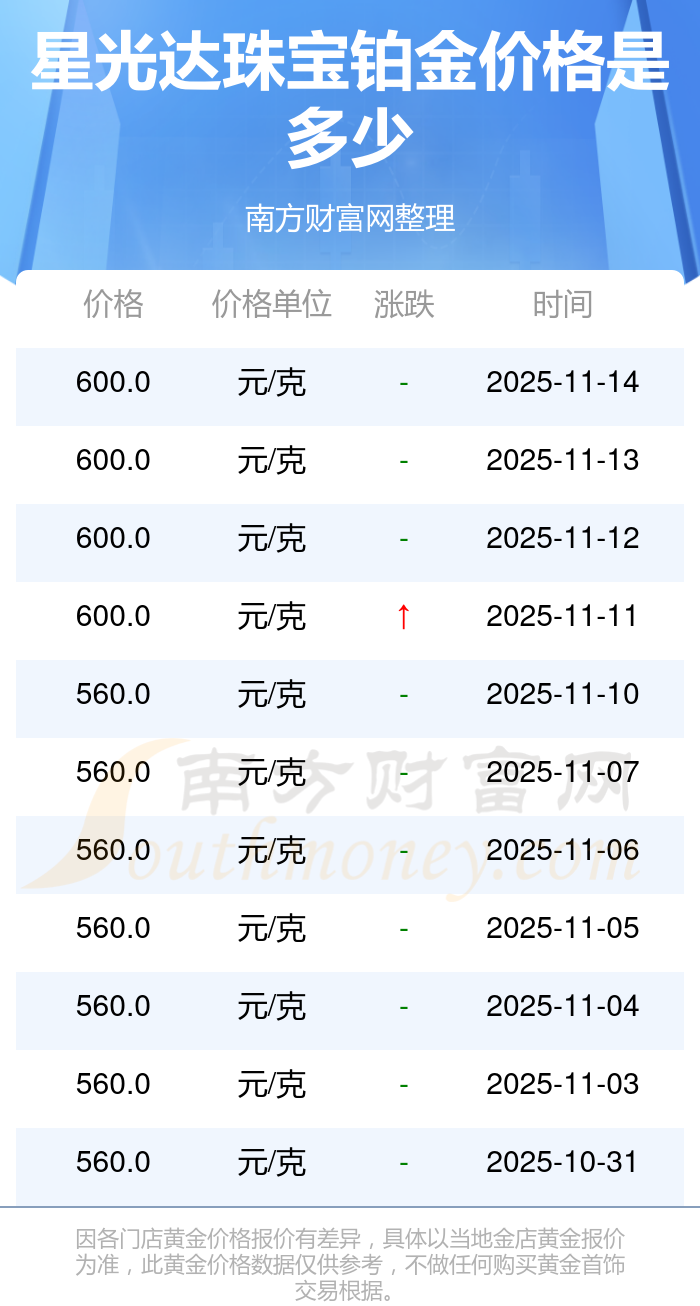 星光達(dá)珠寶今日鉑金價(jià)格的最新標(biāo)價(jià)為600.0元/克。