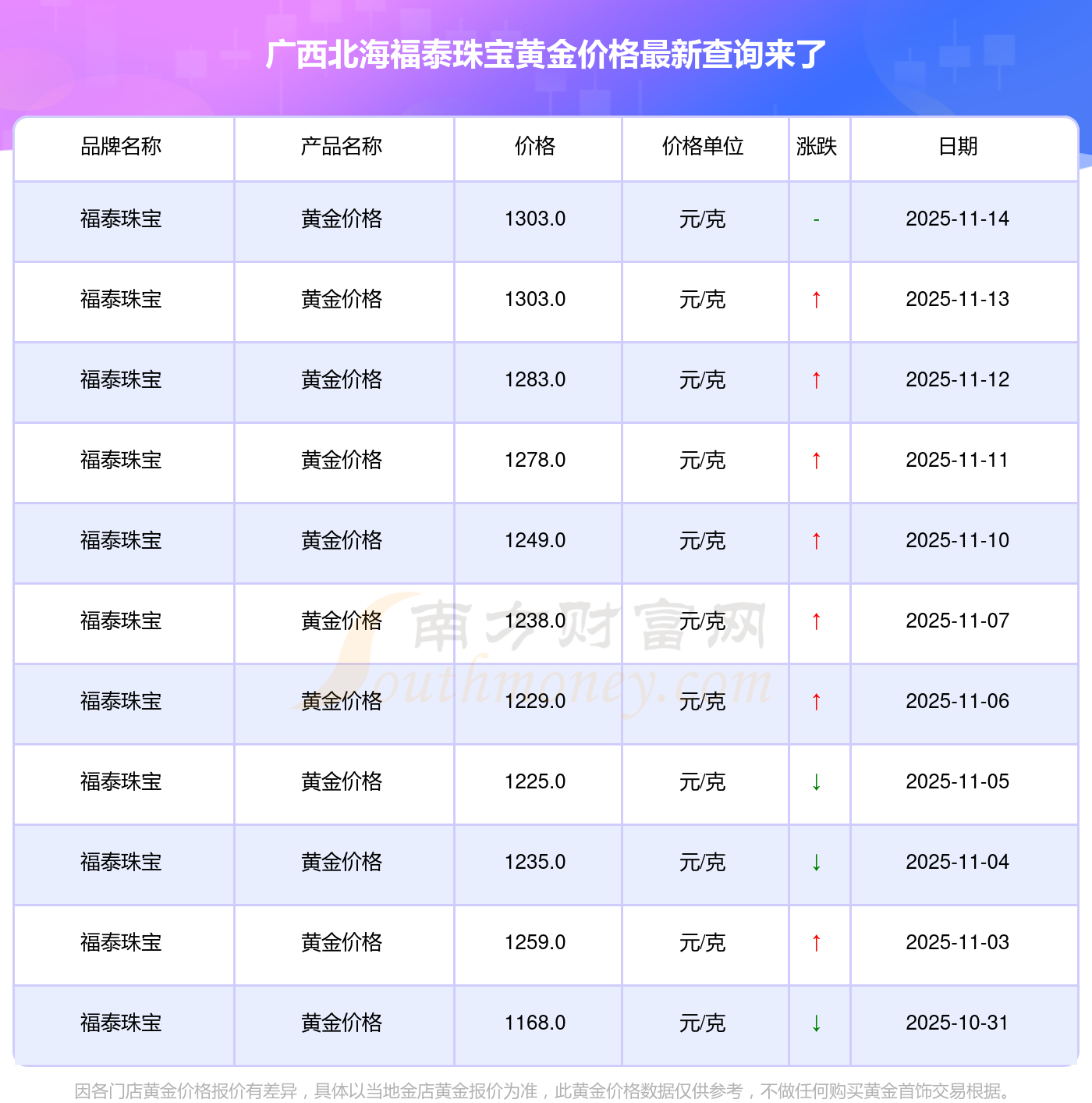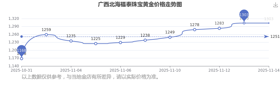 今天黃金每克的價值是多少?今日廣西北海福泰珠寶黃金價格查詢,今日(2025年11月16日)廣西北海福泰珠寶黃金價格為1303.0元/克。