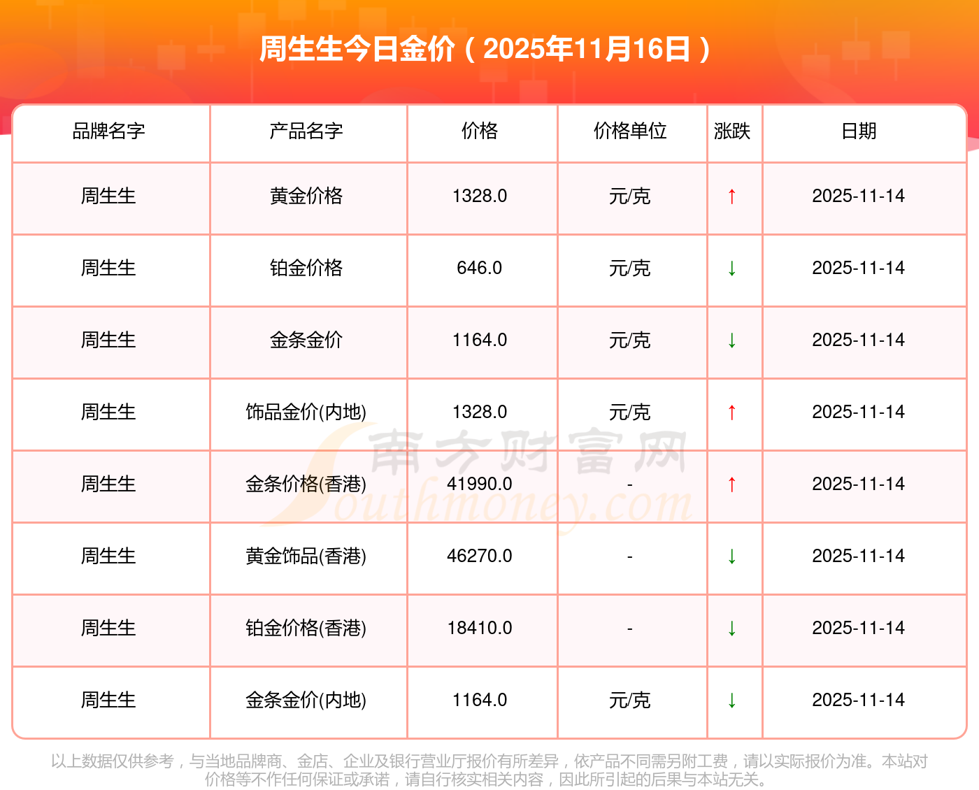 2025年11月16日周大福、周大福、周大福、周大福、周大福、周大福、周大福、老鳳祥、老鳳祥、老鳳祥、周六福等各大金店品牌黃金價格最新價格如下:周大福黃金價格1333.0元/克,周大福鉑金價格646.0元/克,周大福飾品金價(內(nèi)地)1333.0元/克,周大福黃金飾品(香港)46320.0,周大福鉑金價格(香港)18410.0,周大福金條價格(香港)41780.0,周大福金條金價(內(nèi)地)1167.0元/克,老鳳祥黃金價格1322.0元/克,老鳳祥鉑金價格600.0元/克,老鳳祥足金價格1322.0元/克,周六福黃金價格1295.0元/克。