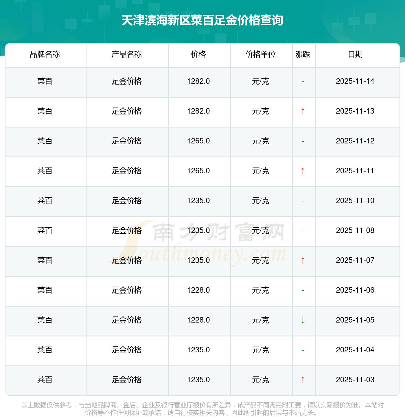 今日(2025年11月16日)天津濱海新區(qū)菜百足金價格:1282.0元/克。