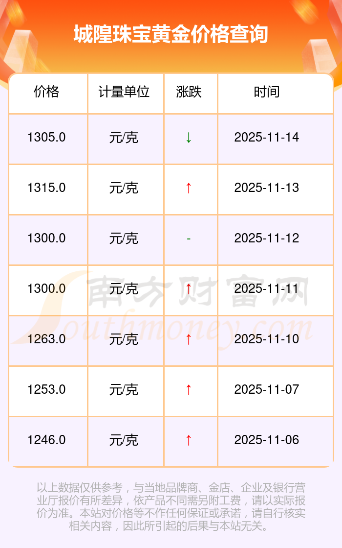 想查詢今日黃金價格,當(dāng)下黃金一克具體售價幾何?通常情況下黃金每一克的價格大概是多少呢?今日城隍珠寶 黃金價格最新的克重售價為1305.0元/克。