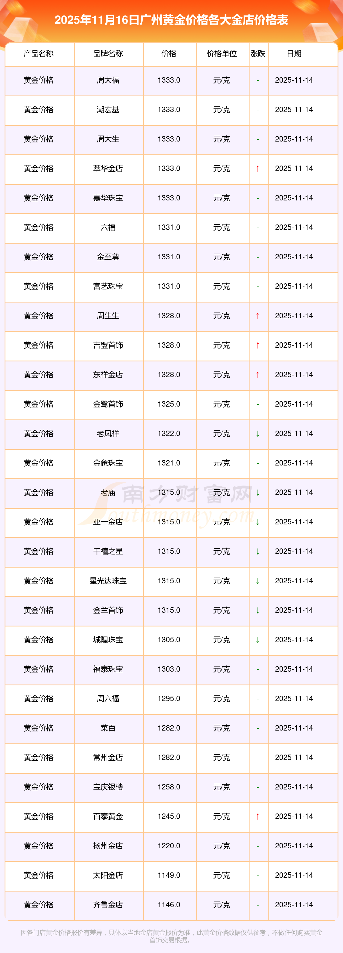 2025年11月16日,廣州周大福、周大福、周大福、周大福、周大福、周大福、周大福、老鳳祥、老鳳祥、老鳳祥、周六福等各大金店品牌黃金價格今日價格行情最新來了:周大福1333.0元/克、周大福646.0元/克、周大福1333.0元/克、周大福46320.0、周大福18410.0、周大福41780.0、周大福1167.0元/克、老鳳祥1322.0元/克、老鳳祥600.0元/克、老鳳祥1322.0元/克、周六福1295.0元/克。